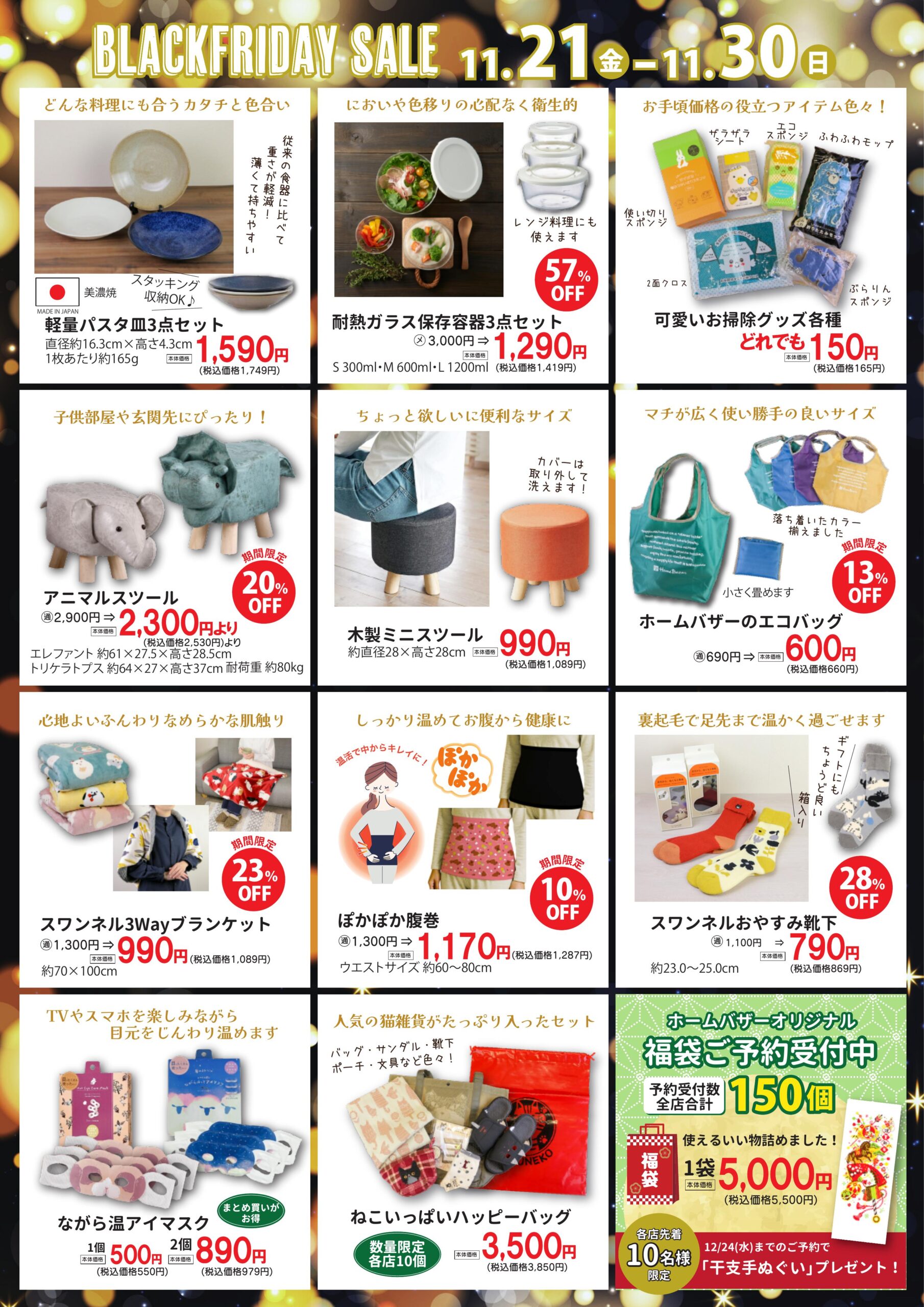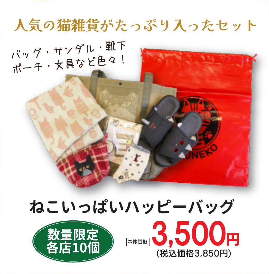 雑貨屋さんらしいハッピーバッグも、ブラックフライデーで発売します!毎年即完売の『ねこいっぱいハッピーバッグ』は、各店限定10個での販売です。赤いねこの袋を見つけたら、迷わずゲットして下さいね!