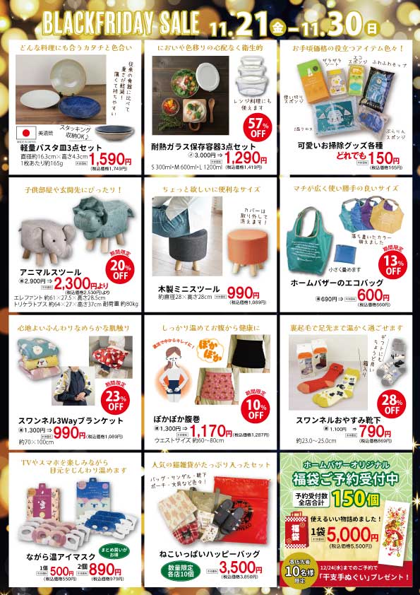 この他にも、食器のセットものやスツール類、あったか小物など様々なアイテムをお買得価格で取り揃えてお待ちしております。ぜひ、ホームバザー各店へお越しください。皆様のお越しをお待ちしております。