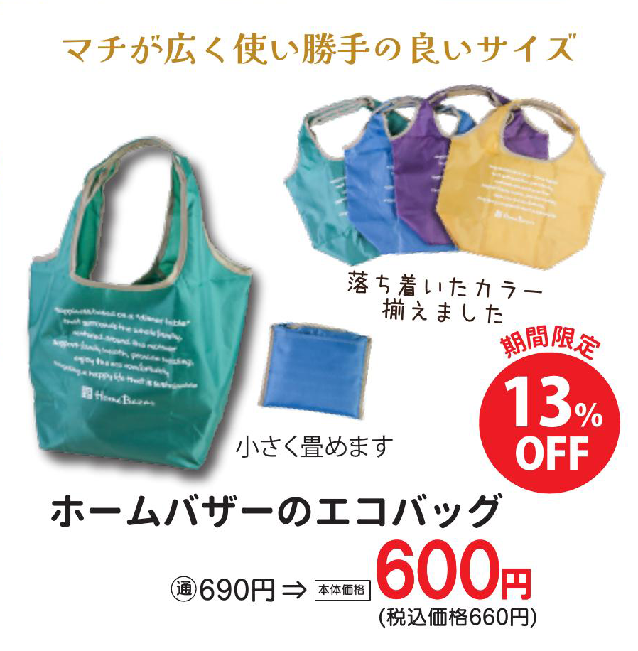 オリジナルのエコバッグも、この期間だけのお買得価格で登場!落ち着いたカラーバリエーションで、コンパクトに畳めるから、バッグに忍ばせておけば急な買い物のときに役立ちます。底のマチをしっかりとった作りなので、多く買い過ぎても意外と収まってくれますよ!