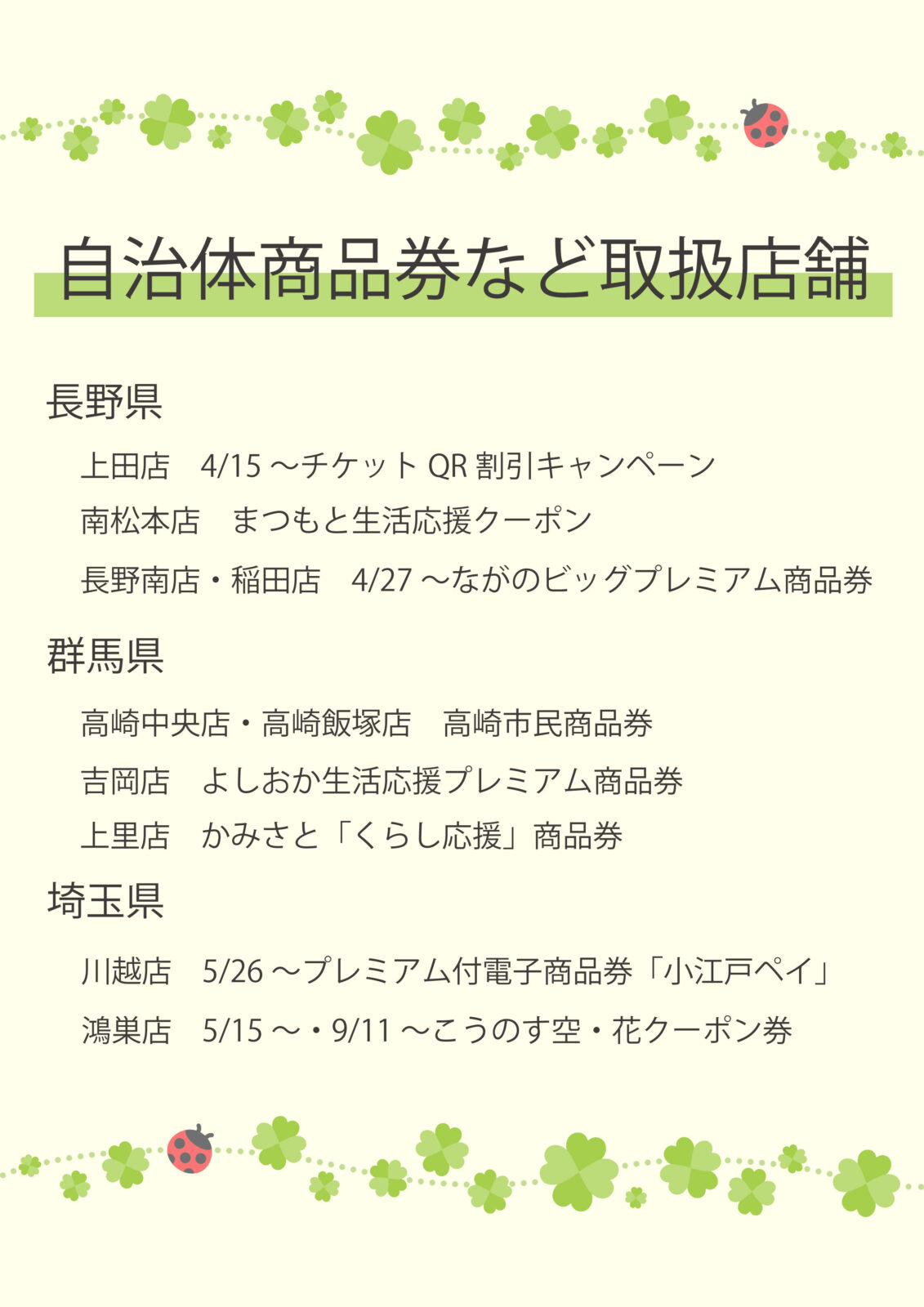 ホームバザー各店でも、店舗がある自治体の商品券などの取扱店として登録しております。お買物の参考にお役立て下さい。