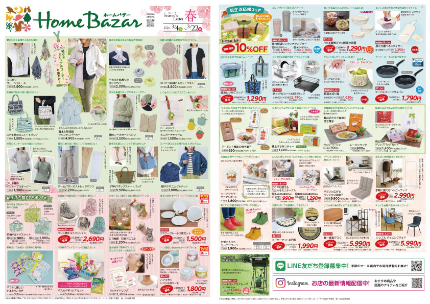 新しい季節に、身につけたくなるお洋服やファッション小物などを中心に揃えました。また、この季節に必要な春ギフトや、新生活におすすめのお買得アイテムなども並びます。ワクワクする春に、ホームバザーでのお買い物で、素敵な暮らしを送りませんか。