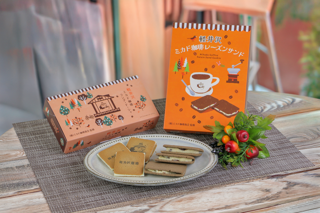 軽井沢にあるモカソフトで有名な「ミカド珈琲店」監修。生地にコーヒーを練りこんだ風味豊かな味わいが美味しい、ラングドシャとレーズンサンドのラインナップです。試食をしたお客様にも大変好評で、「美味しかった」と購入して頂く方が続出しました。まだの方は、ぜひ味わいください。