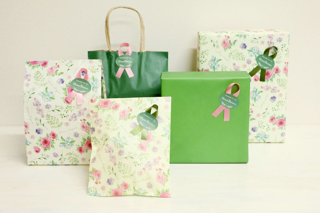 ホームバザーでは、オリジナル包装紙でのラッピングや、紙袋に入れてのラッピングは無料で承っております。季節に合わせたリボンシールもお付けすることができます。謝恩会やその他イベントなどでの大量包装も承りますので、スタッフまでお気軽にご相談ください。