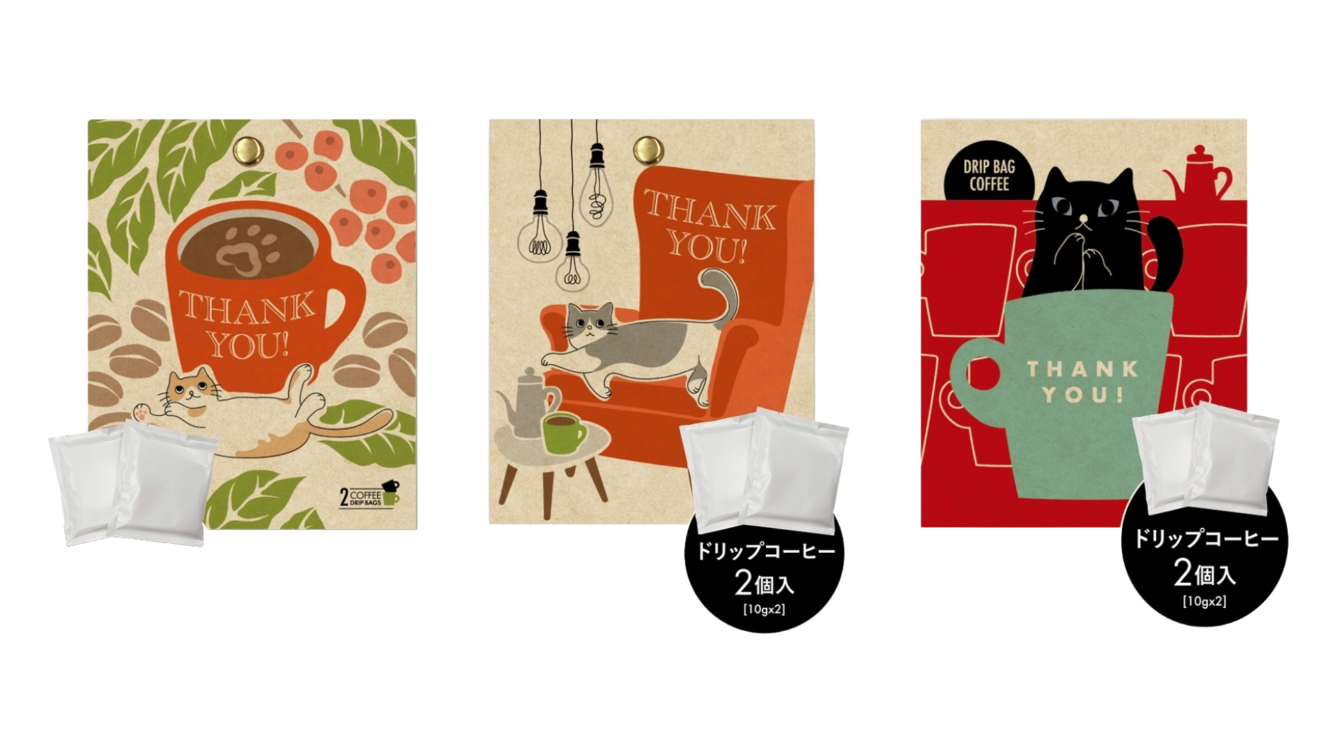 「Thank you」のメッセージ入りのパッケージに入った、ドリップコーヒー2個セット。可愛くておしゃれな猫のイラストで、ちょっとしたギフトにぴったりです。たっぷり10gのコーヒー豆が入っているので、ぜいたくなコーヒータイムが送れますよ。