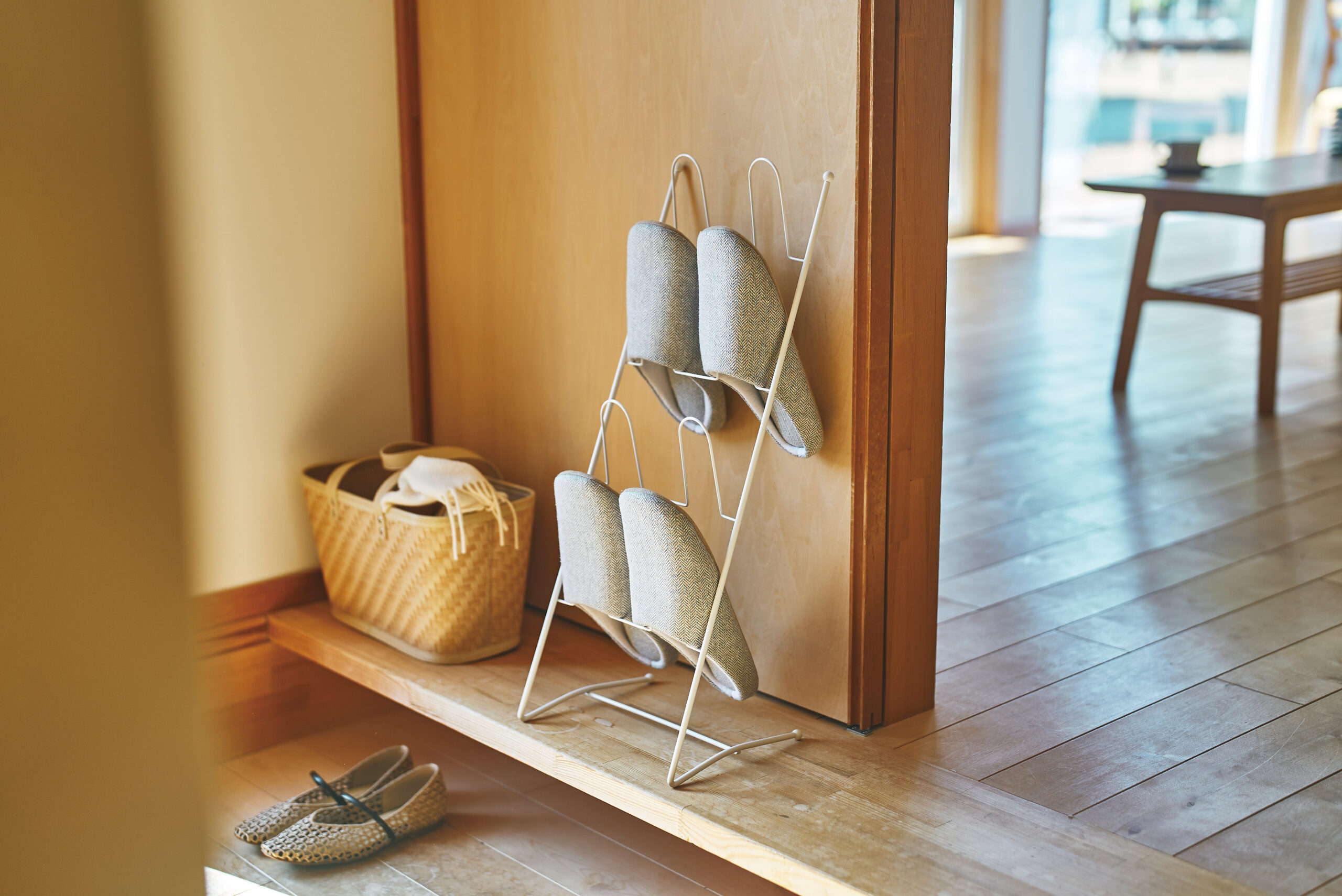 シンプルなワイヤー製のスリッパラック。今の時期に履いている冬用のちょっと大きめスリッパや、子供用も一緒に掛けておくことができます。お手頃価格なので、一緒にスリッパもホームバザーで新調するのがおすすめです。