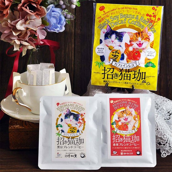 黒大豆・赤米を使用した縁起の良いコーヒー「招き猫珈」。岡山県産黒大豆「昨州黒」、赤米玄米「あかおにもち」をカフェインレスコーヒー豆とそれぞれブレンド。黒豆ブレンドは、大豆の特有の甘みにより酸味を感じにくいのが特徴。赤米ブレンドは、お米の清涼感で後口をひかず、カフェオレにもおススメです。